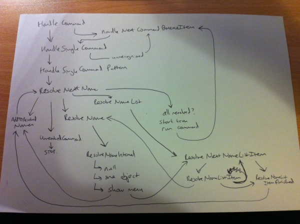 Being unable to block the thread to display a menu meant that I had to rewrite the parser, as this often needs to display menus to resolve the typed-in object names. I drew myself the diagram below and almost descended into insanity in the process: