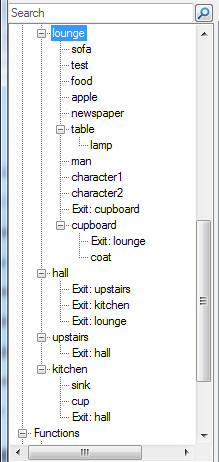 Every kind of thing in Quest is an element – an object, a verb, an exit, a function… they’re all elements, and they’re all displayed in the tree on the left hand side of the Editor window. It will be familiar to Quest 4 users, but it’s even better in Quest 5 – if you have objects inside objects inside other objects, you can see the full hierarchical relationship within the tree, and you can click and drag to move elements around. It also has a search feature.